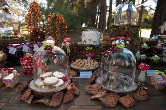 Qué bonita presentación para una fiesta infantil al aire libre: ¡no lo dudes, si el cumple cae en otoño!Esta idea me encanta para las fiestas de cumpleaños que se celebran cuando va a entrar el otoño… Es estupenda para esos cumples que todavía se pueden celebrar al aire libre. La idea de representar un bosque está tan conseguida que parece que en cualquier momento vas a encontrar un gnomo escondido en la mesa preparando nuevos aperitivos o que un hada saldrá volando al levantar una de esas preciosas campanas de cristal…