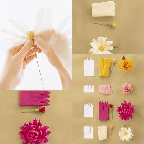 Estas delicadas flores de papel, tan reales que dan ganas de acercar la nariz para oler su perfume, están hechas en papel crepe de diferentes colores. La técnica es bien sencilla, como vemos en esta foto que traemos del blog Ahora también Mamá.